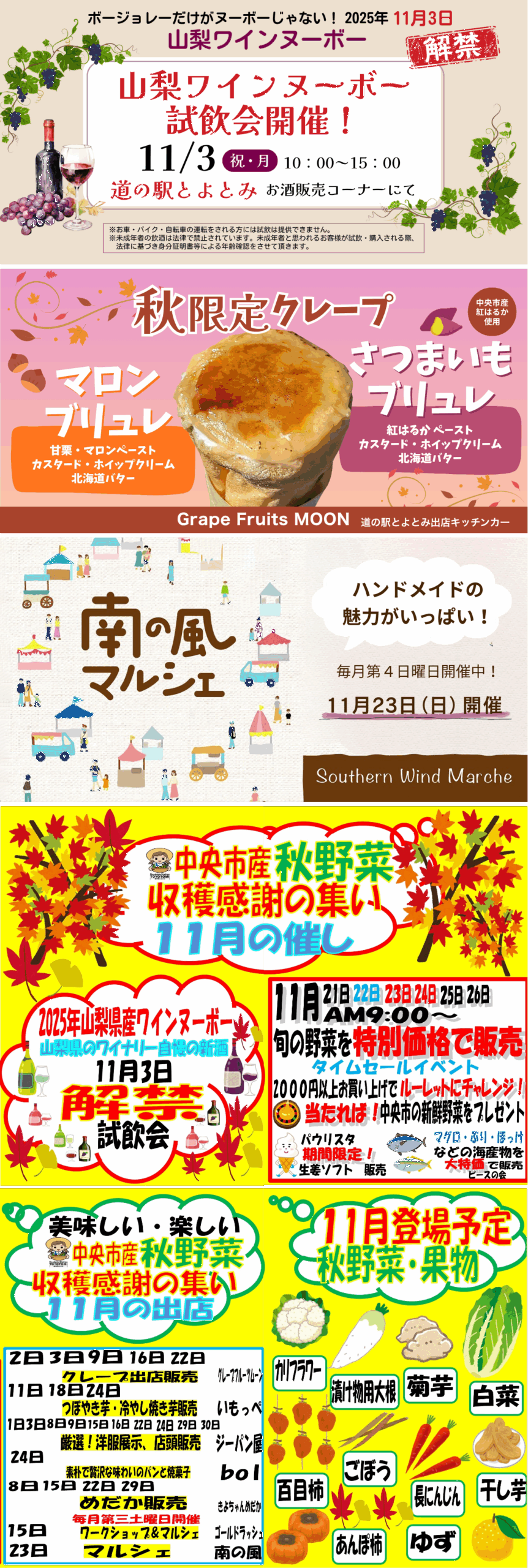 | 3 (月) | 2025年山梨県産ワインヌーボー 山梨県のワイナリー自慢の新酒解禁試飲会 | 道の駅とよとみ |