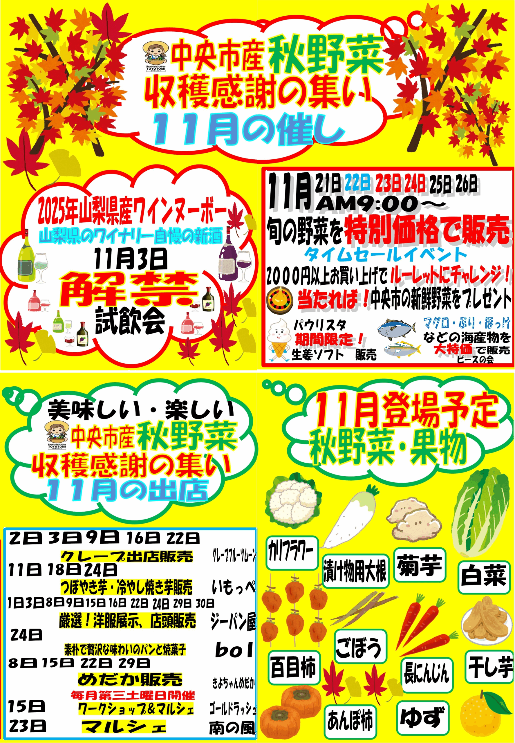 | 25 (火) | 旬の野菜を特別価格で販売 《タイムセールイベント》 2000円以上お買い上げでルーレットにチャレンジ! 当たれば!中央市の新鮮野菜をプレゼント | 道の駅とよとみ |