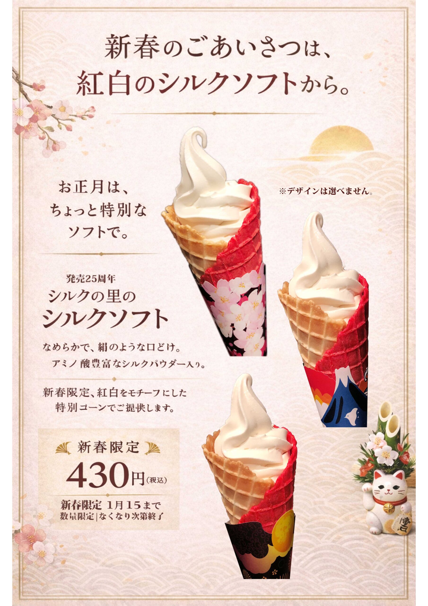 大人気のシルクソフトが新春限定紅白特別コーンで登場! 1月15日までの数量限定!無くなり次第終了となります。 ぜひどうぞ(^^)/