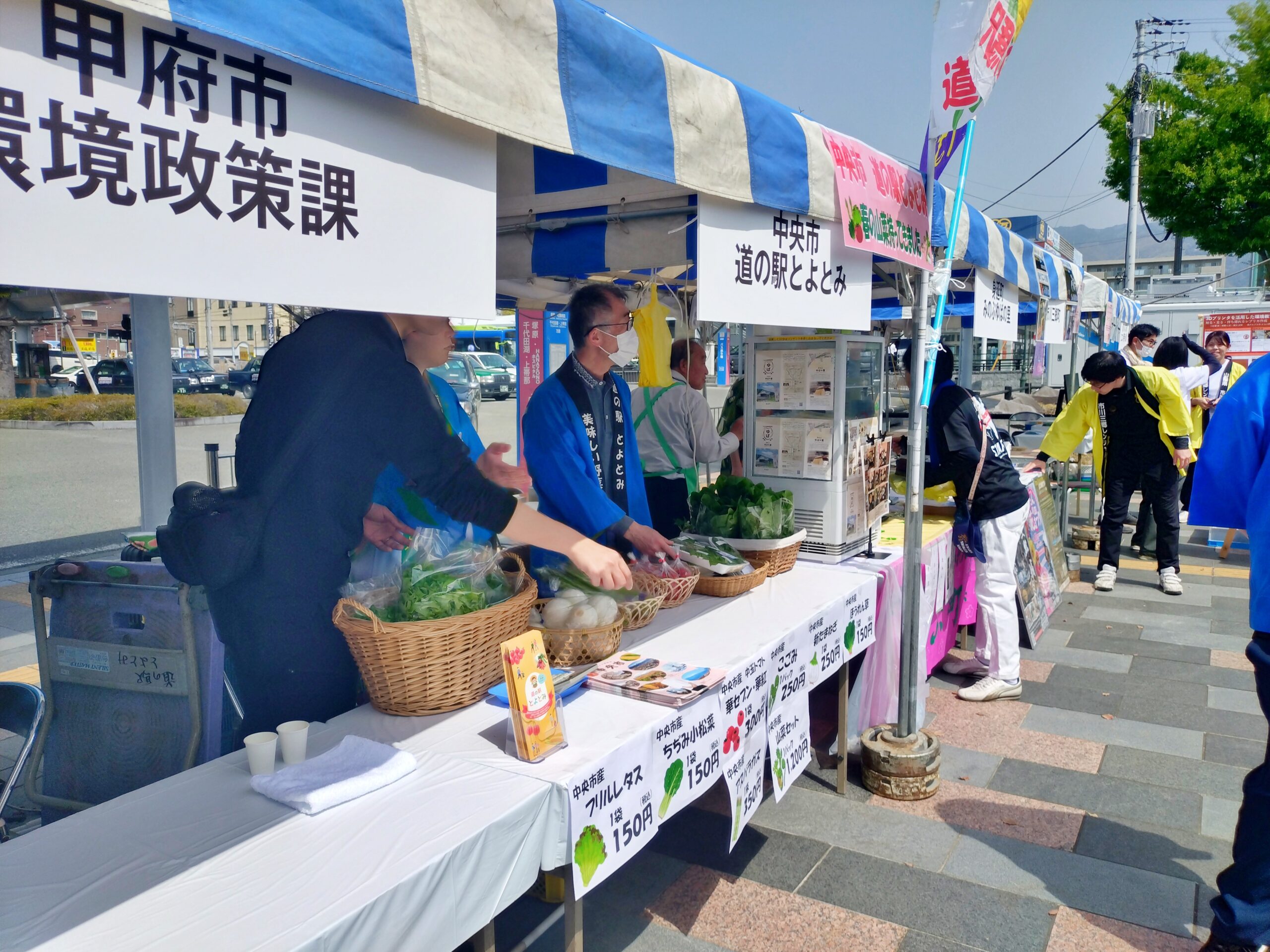 道の駅とよとみ出張店では、市の担当者と一緒に、旬の山菜をはじめ、中央市産のトマト、新玉ねぎ、アスパラガス、葉物などを販売し、併せて、つい先日完成したばかりの中央市観光パンフレットも配布させていただきました。